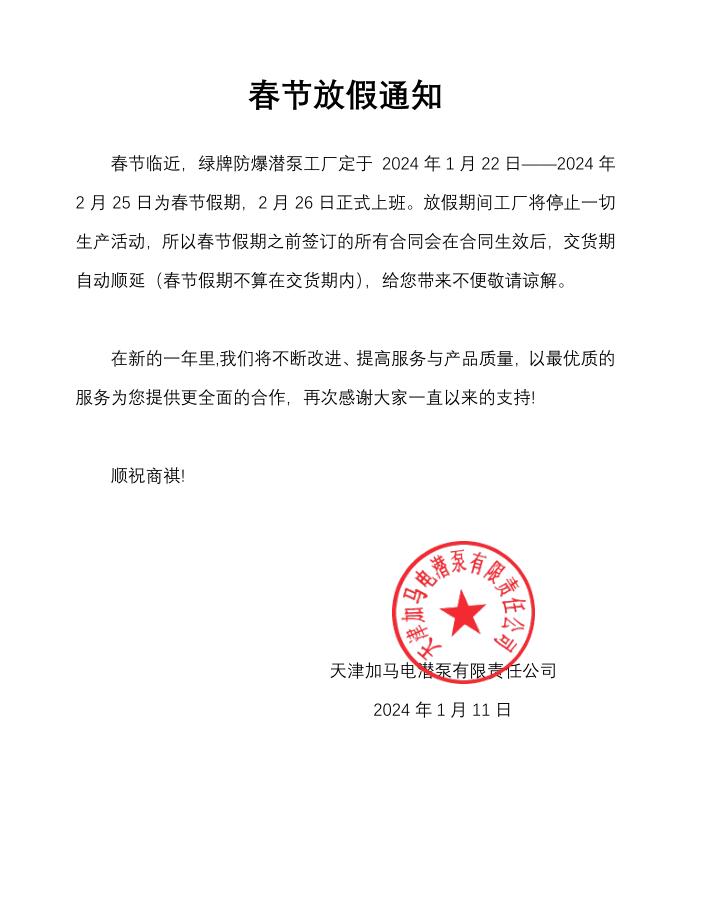 春節(jié)臨近,綠牌防爆潛泵工廠定于 2024年1月22日——2024年 2月25日為春節(jié)假期,2月26日正式上班。放假期間工廠將停止一切生產(chǎn)活動,所以春節(jié)假期之前簽訂的所有合同會在合同生效后,交貨期自動順延(春節(jié)假期不算在交貨期內(nèi)),給您帶來不便敬請諒解。