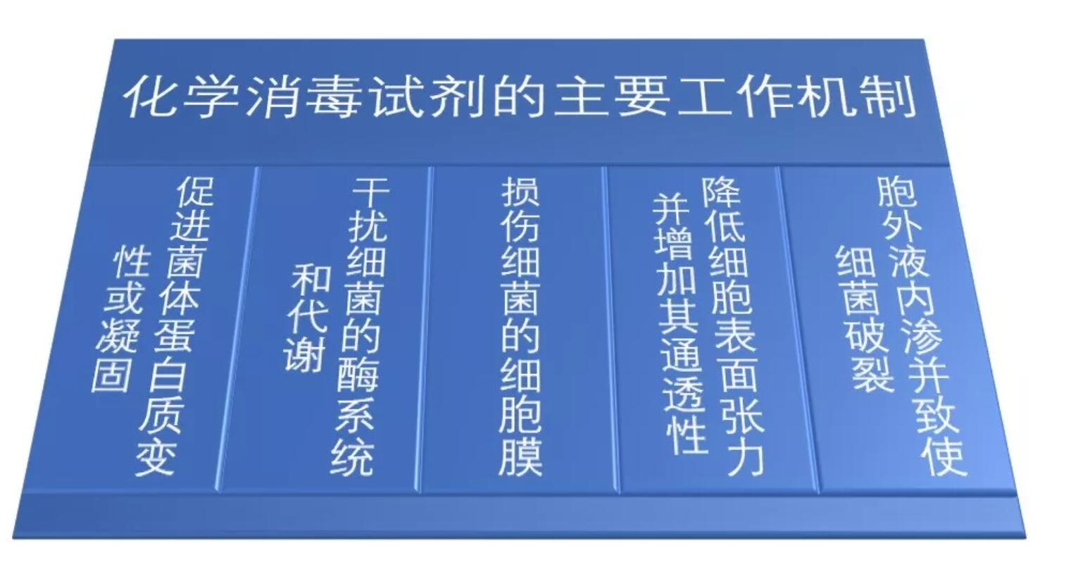 化學消毒試劑能夠影響細菌的化學組成、物理結構和生理活動,從而發(fā)揮消毒或滅菌的作用?;瘜W消毒試劑的工作機制主要包括促進菌體蛋白質變性或凝固、干擾細菌的酶系統(tǒng)和代謝、損傷細菌的細胞膜、降低細胞表面張力并增加其通透性、胞外液內滲并致使細菌破裂等。