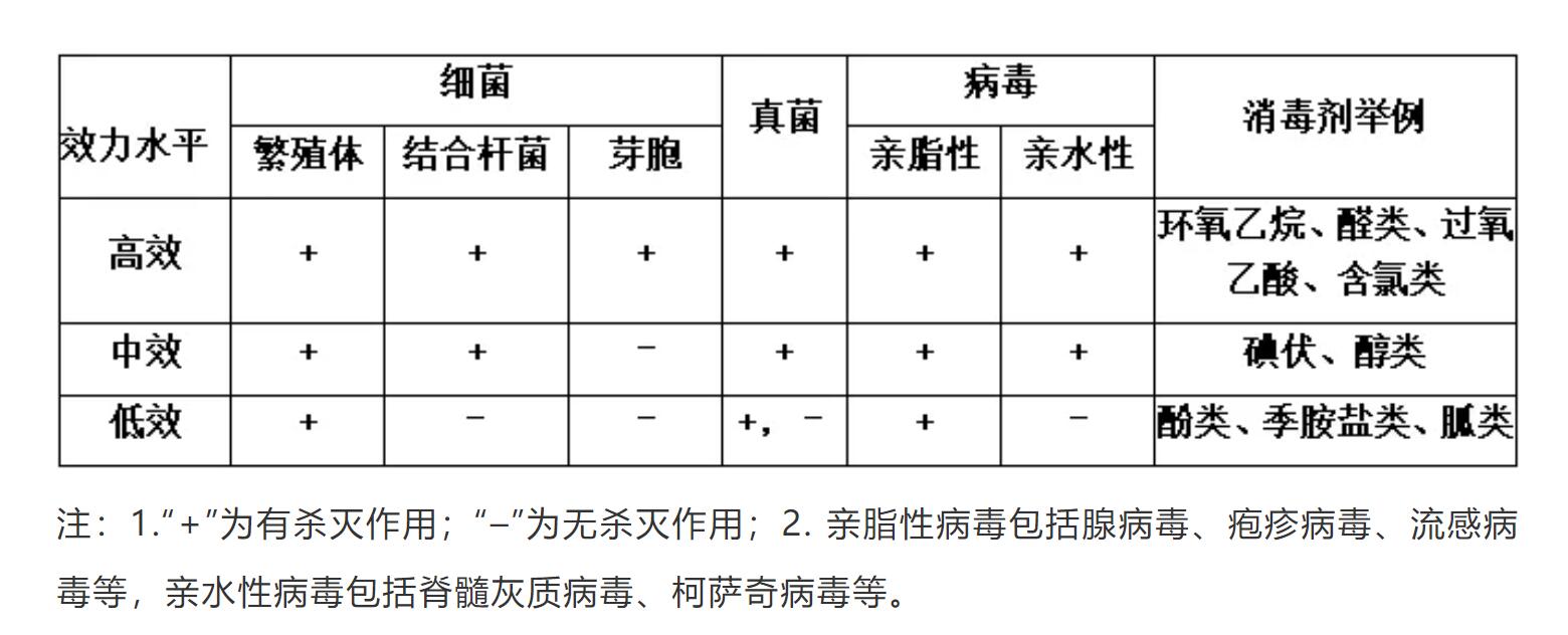 根據(jù)其對微生物的殺滅作用可分為高效、中效、低效三類。各類化學消毒劑的效力水平見下表。