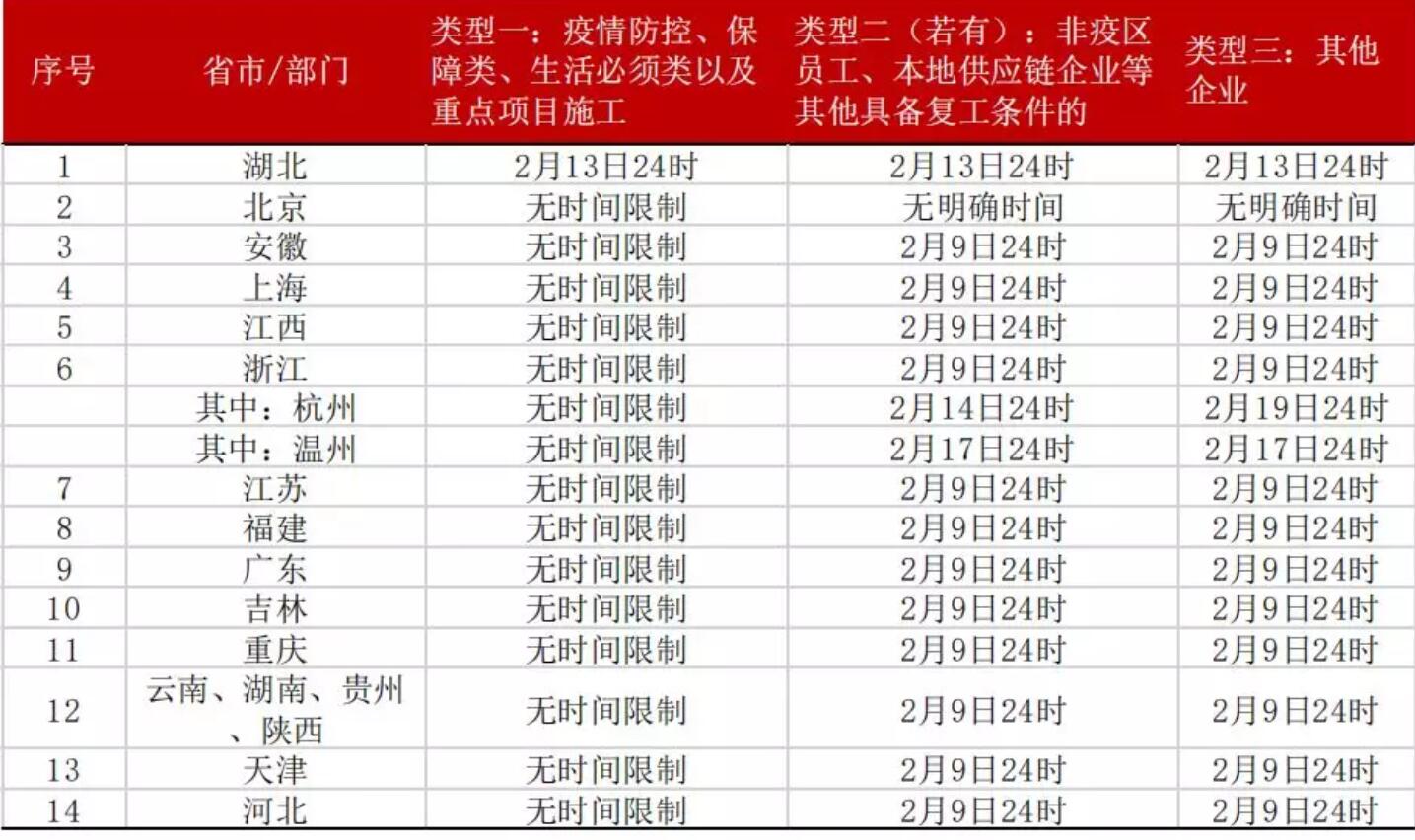 受新型冠狀肺炎疫情影響,今年各行各業(yè)的復(fù)工復(fù)產(chǎn)堪稱一波三折。1月30日,疫情防控重點(diǎn)物資企業(yè)先行復(fù)工;2月3日開始,金融類等部分企業(yè)也開始陸續(xù)復(fù)工復(fù)產(chǎn);2月10日開始,除了個(gè)別省市以外(如湖北、浙江杭州和溫州等)全國30個(gè)省市迎來了第一波復(fù)工復(fù)產(chǎn)潮。