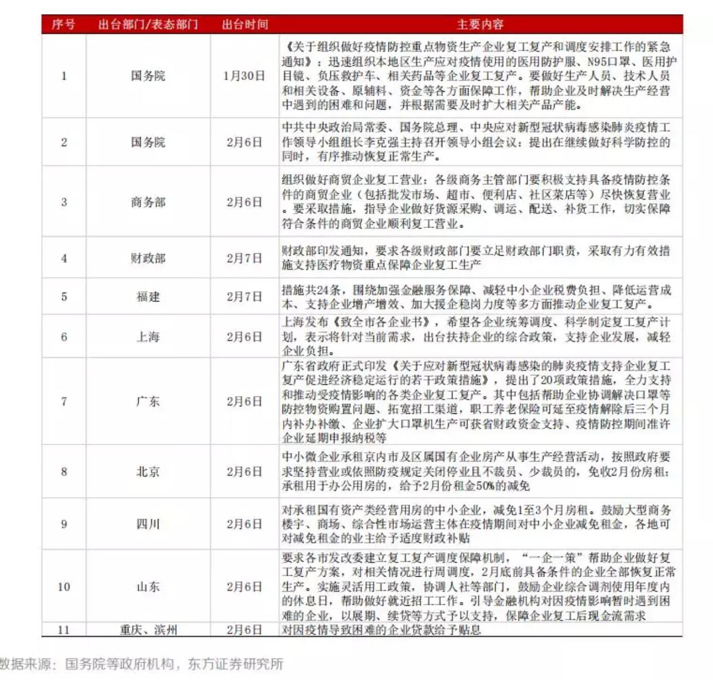 國務(wù)院、商務(wù)部、財(cái)政部、央行等多部門也相繼發(fā)布支持企業(yè)復(fù)工復(fù)產(chǎn)的政策。各地政府更是出臺(tái)了支持企業(yè)復(fù)工并嚴(yán)控疫情的相關(guān)政策。
