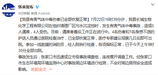 新京報快訊 據(jù)河北懷來縣委宣傳部官方微博消息,7月22日16時30分許,河北懷來縣長城生物化學(xué)工程有限公司在組織清理廠區(qū)污水沉淀池時,發(fā)生有害氣體中毒事故,造成5人遇難,4人受傷。