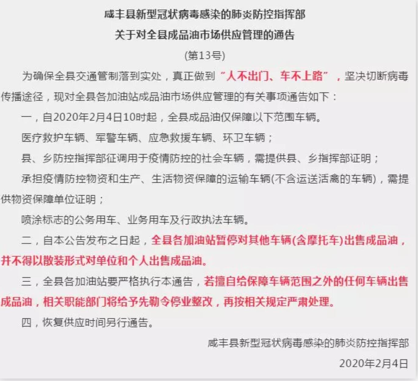 2月4日湖北省恩施土家族苗族自治州咸豐縣新型冠狀病毒感染的肺炎疫情防控指揮部發(fā)布的最新通告顯示,該縣從4日上午10時(shí)起,對4類車輛以外的普通車輛及個(gè)人,實(shí)行“斷油”措施。