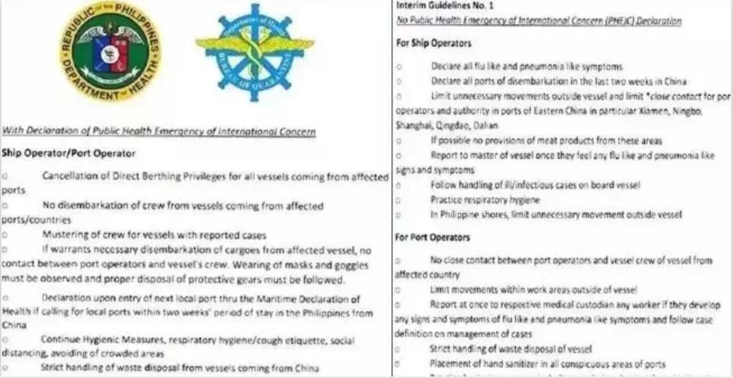 2月3日,菲律賓衛(wèi)生部發(fā)布公告,在所有港口,將對來自中國等新型冠狀病毒高發(fā)國家的船舶,采取一系列管控措施!以避免病毒通過船舶等形式輸入菲律賓。