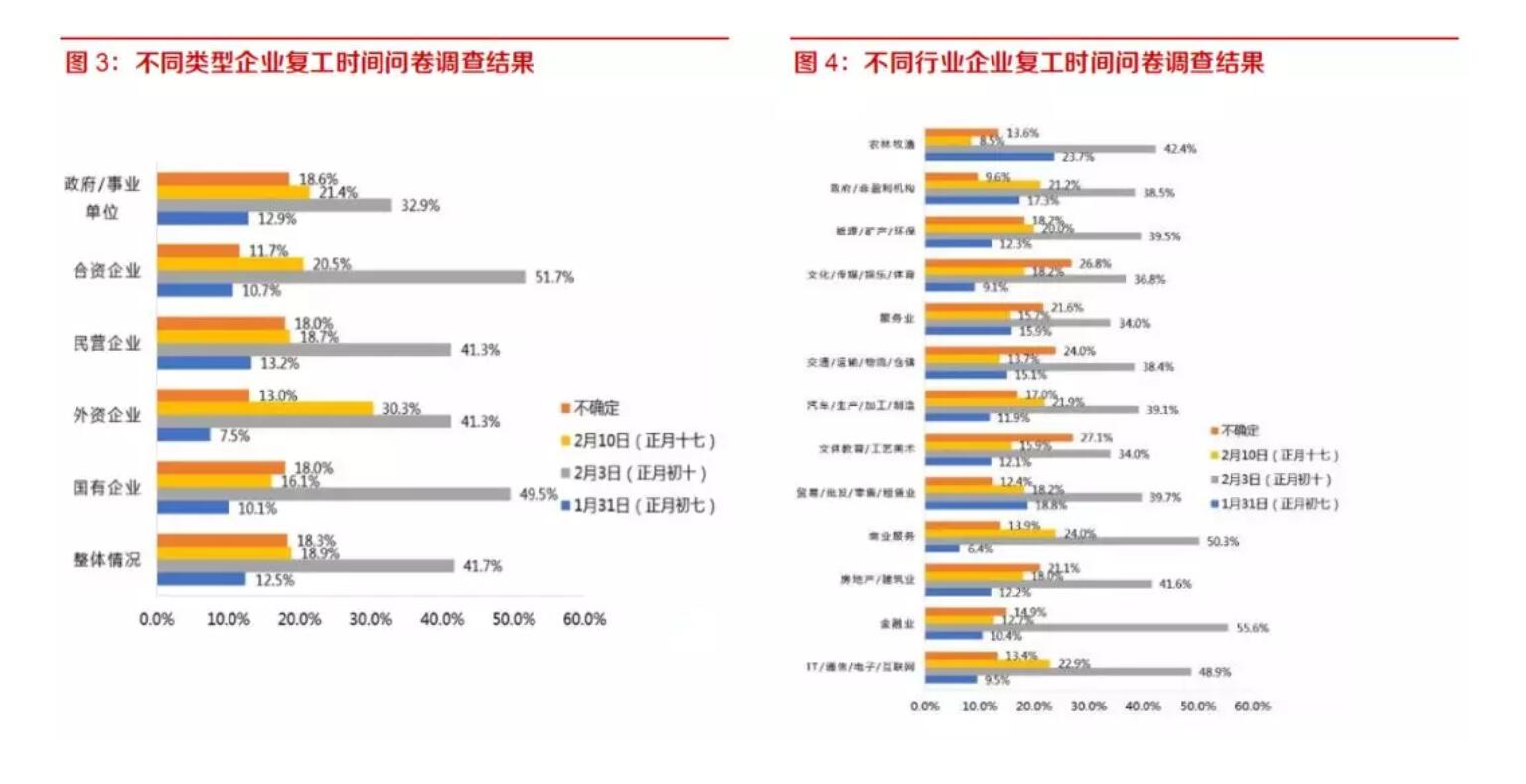(1)依然有近40%的公司和員工復(fù)工時(shí)間在2月9日之后,或者不確定時(shí)間。