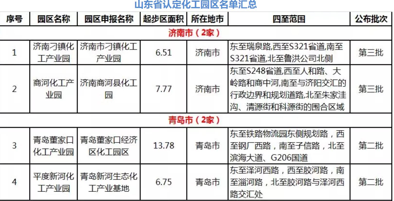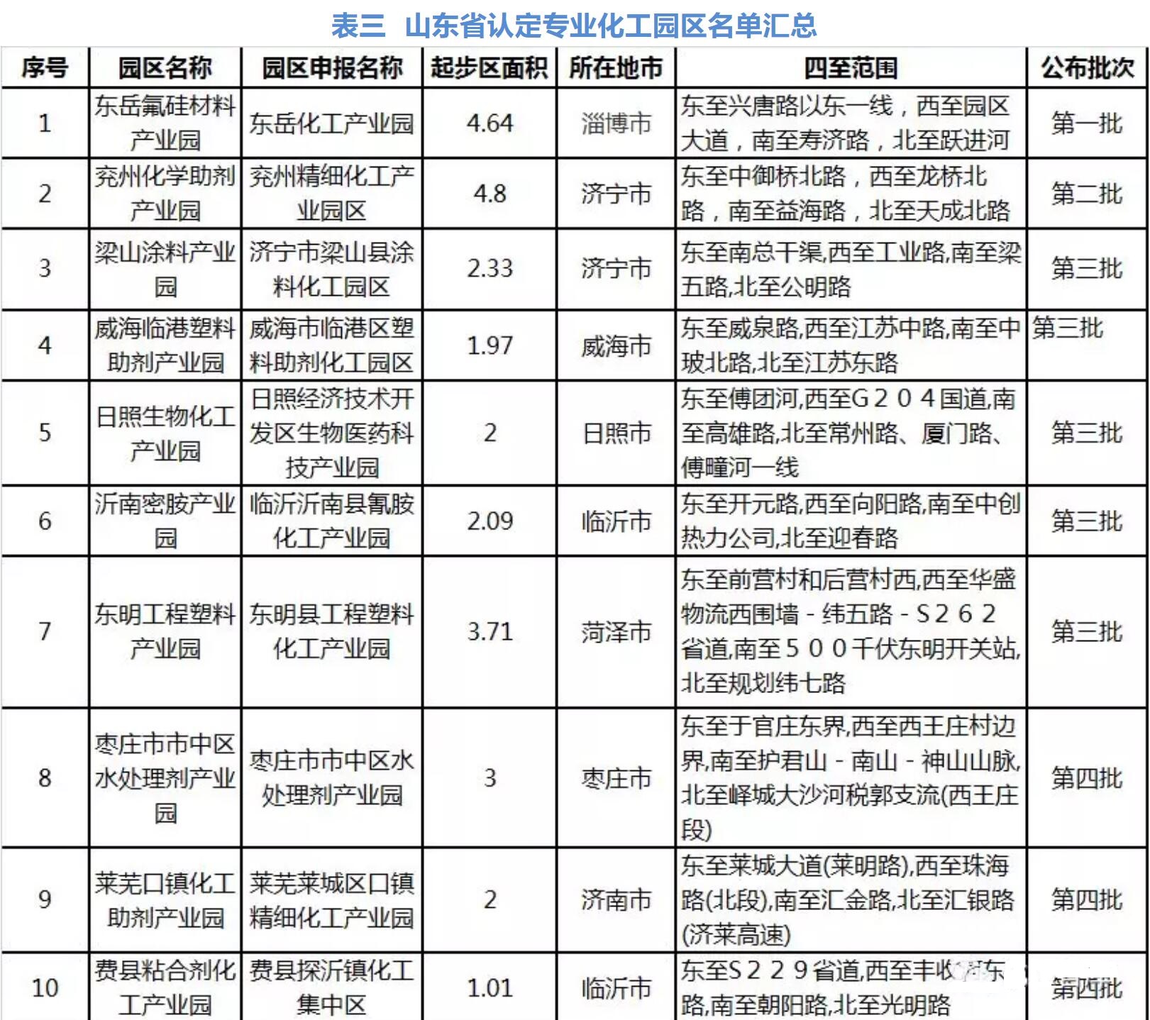 表三 山東省認(rèn)定專業(yè)化工園區(qū)名單匯總