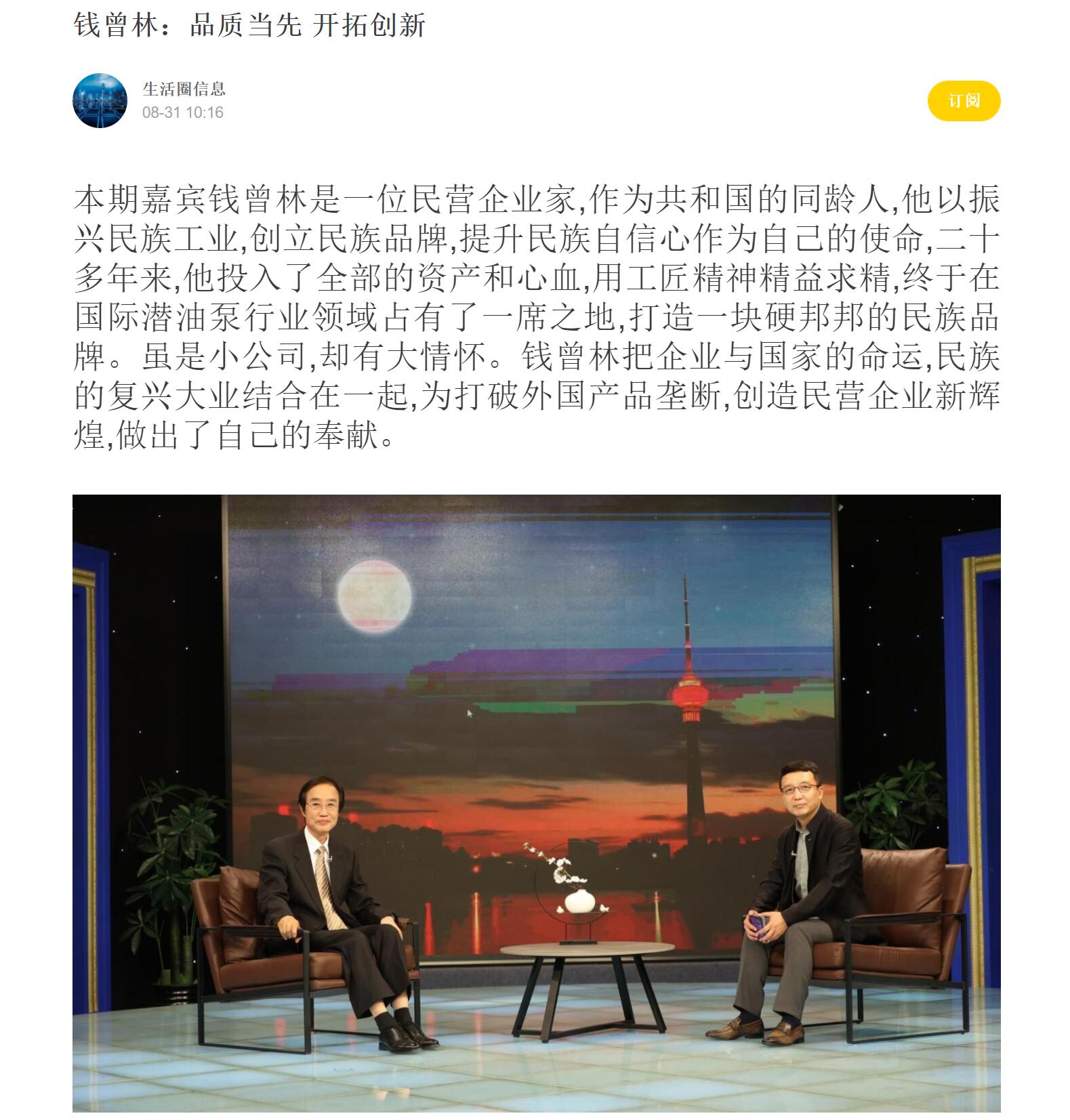 本期嘉賓錢曾林是一位民營企業(yè)家,作為共和國的同齡人,他以振興民族工業(yè),創(chuàng)立民族品牌,提升民族自信心作為自己的使命,二十多年來,他投入了全部的資產和心血,用工匠精神精益求精,終于在國際潛油泵行業(yè)領域占有了一席之地,打造一塊硬邦邦的民族品牌。雖是小公司,卻有大情懷。錢曾林把企業(yè)與國家的命運,民族的復興大業(yè)結合在一起,為打破外國產品壟斷,創(chuàng)造民營企業(yè)新輝煌,做出了自己的奉獻。